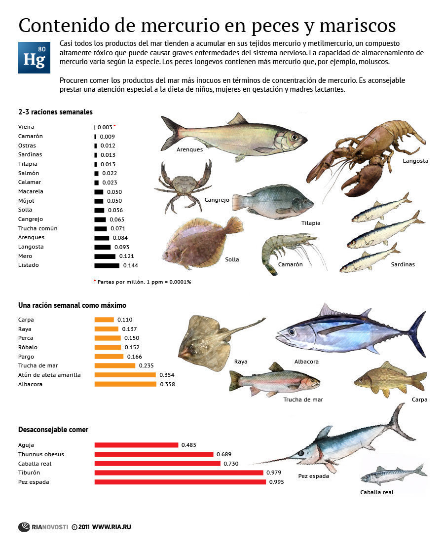 Fa temps que no publicava cap infogràfic (i mira que és senzill!). Aprofitant la perla del dia, m’ha vingut al cap una imatge molt il·lustrativa que vaig veure fa un temps pel que fa als continguts de mercuri i metilmercuri que poden contenir els diferents tipus de peix i marisc. En general, sembla que com més gran i més esperança de vida tenen les espècies marines, més acumulació poden presentar d’aquests metalls pesats -i potencialment tòxics-.