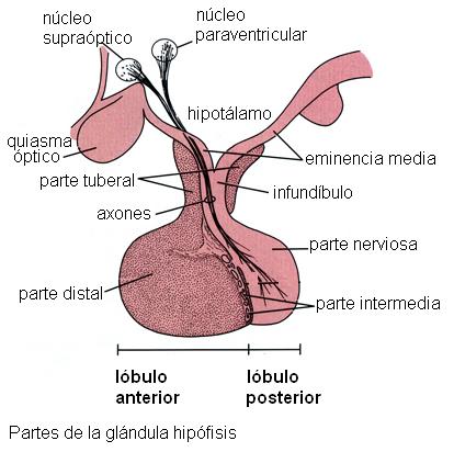 A més, els axons dels nuclis supraòptic i paraventricular de l’hipotàlem arriben fins al lòbul posterior de la hipòfisi transportant hormones sintetitzades als seus cossos cel·lulars: la oxitocina i la hormona antidiurètica.