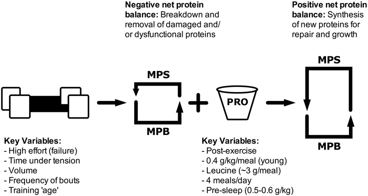 Esquema que mostra com poden afectar les diferents variables relacionades amb l’exercici amb càrregues i la ingesta de proteïna en el balanç net de proteïnes musculars. MPS = síntesi de proteïnes musculars; MPB = degradació de proteïnes musculars; PRO = proteïna.